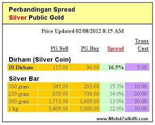 Spreadnya rendah iaitu cuma 6% – sila rujuk carta perbandingan spread emas Public Gold yang saya sediakan tu. Spreadnya sama dengan spread gold bar 20 gram yang harganya 5 kali ganda lebih tinggi, bahkan spread syiling 1 Dinar (6%) lebih rendah berbanding spread gold bar 10 gram (8%).