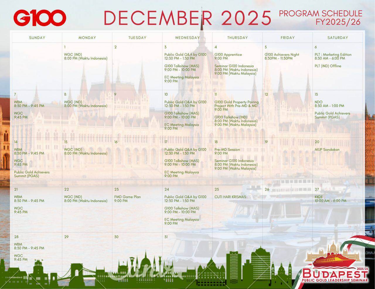 | Public Gold Leadership Training (PLT) | Hari Sabtu, Minggu Pertama Setiap Bulan | Zoom Meeting | Dealer G100 |
