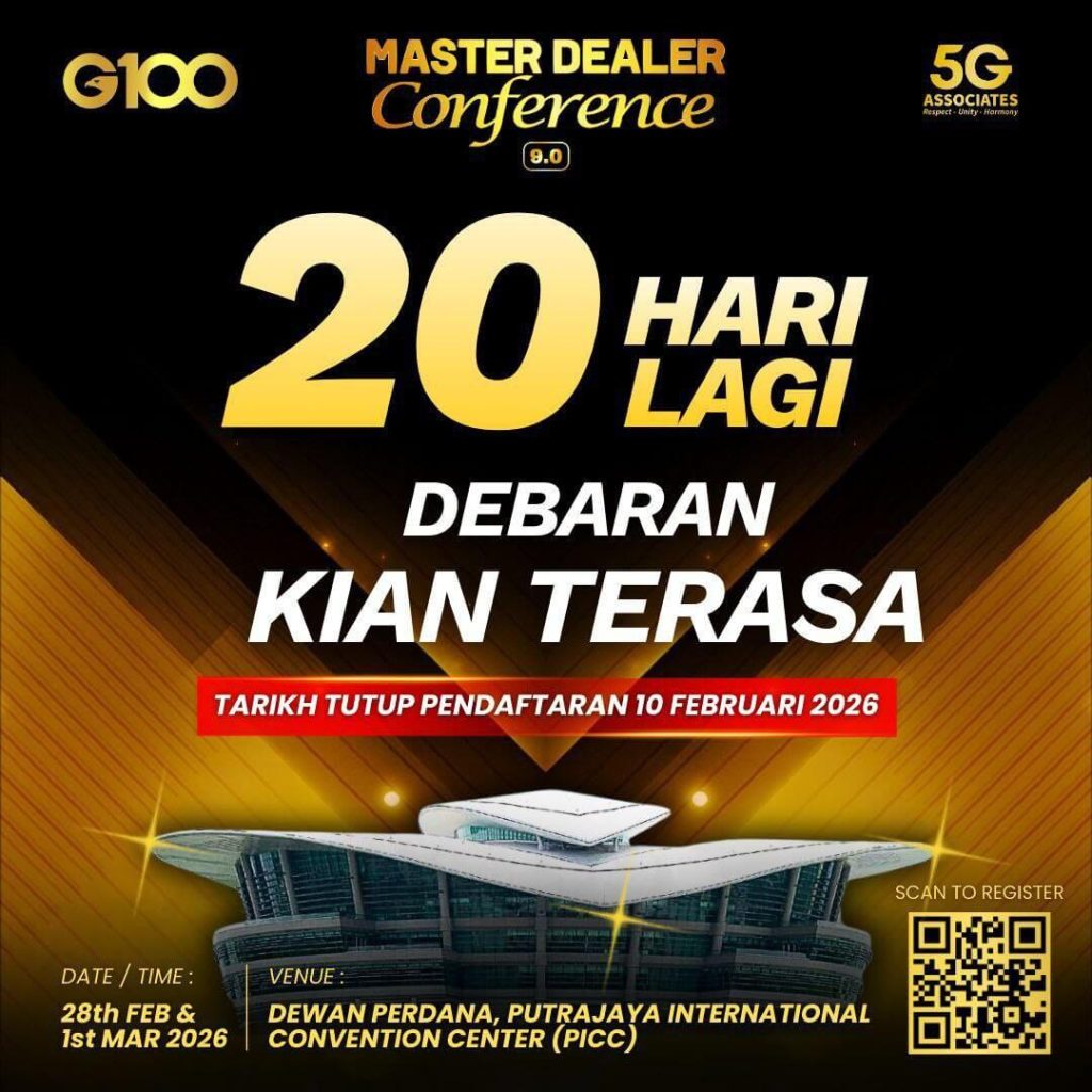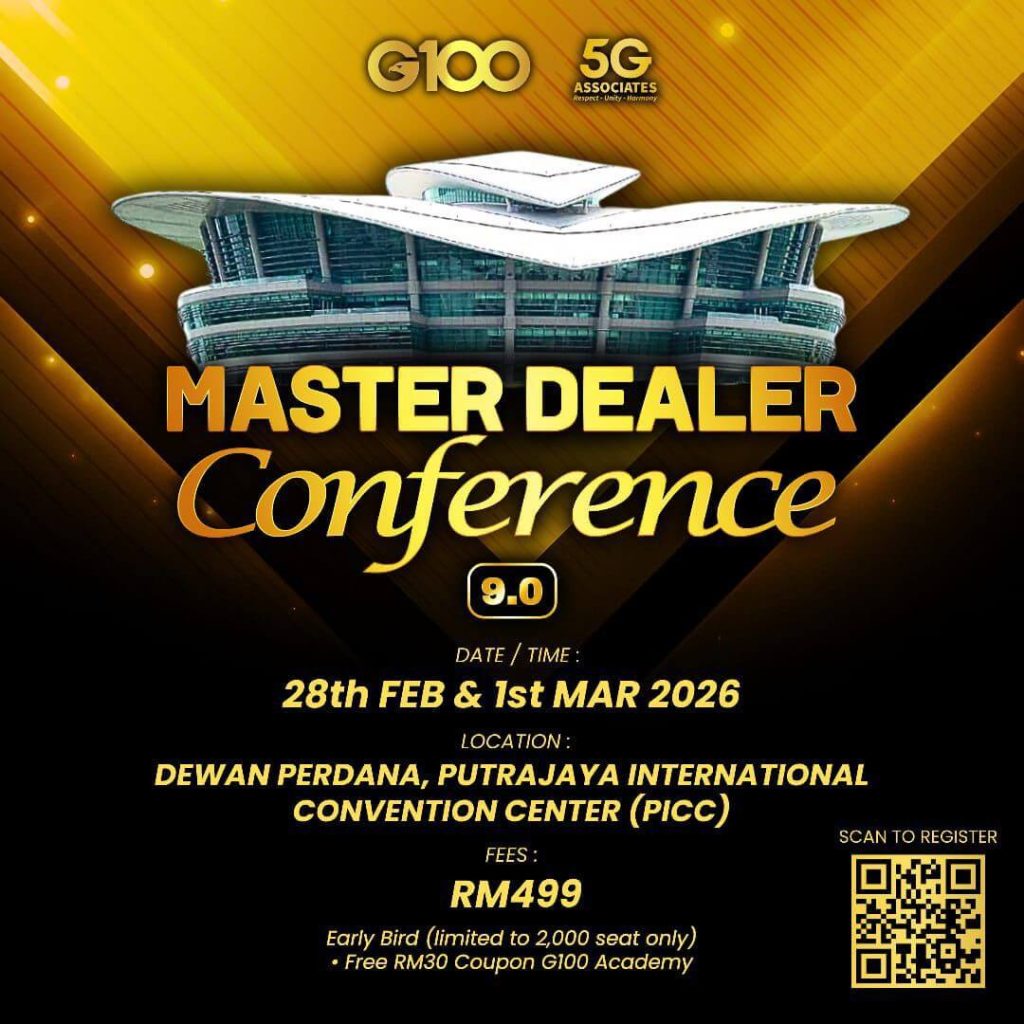 Setelah MD Conference ke-8.0 diadakan pada Ogos 2025 dengan jayanya, G100 akan mengadakan MD Conference untuk kali ke-9.0 pada 28 Feb 2026 – 1 Mac 2026 akan datang. Ini peluang bernetworking bersama Top Achievers dan korek rahsia kejayaan mereka untuk membangunkan serta mengukuhkan bisnes anda sendiri.