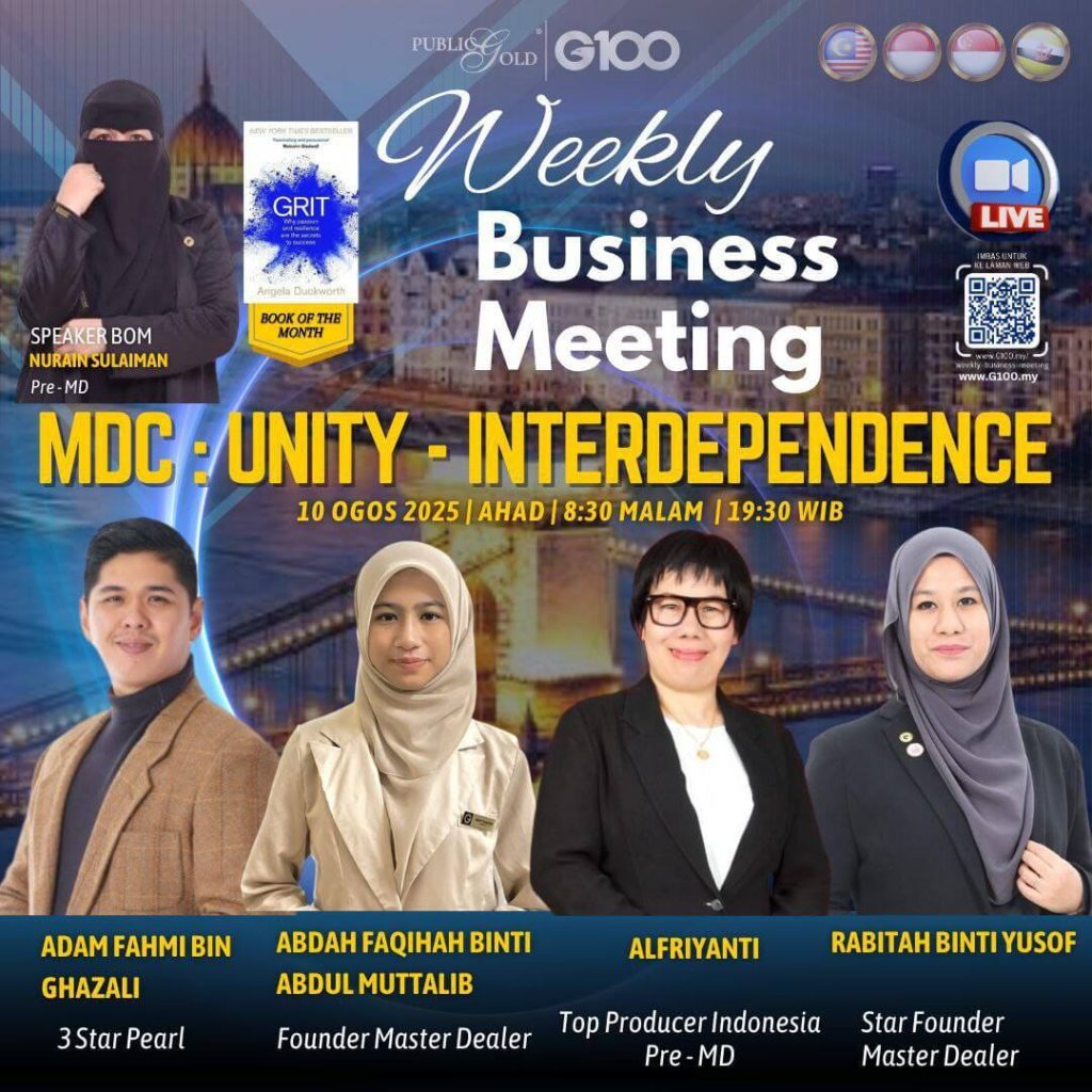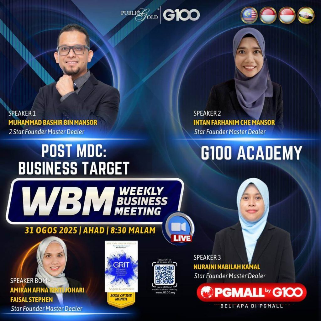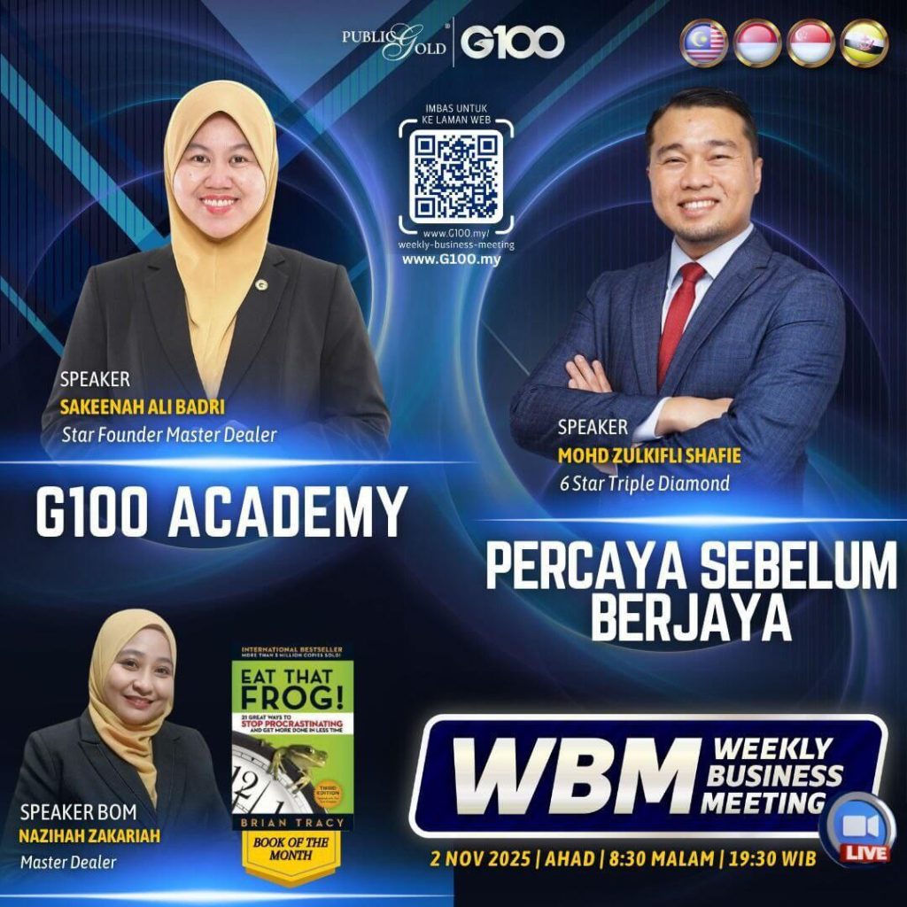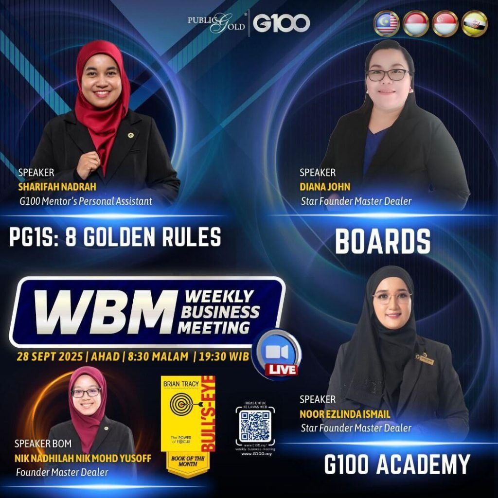 Peluang dapatkan input terkini, associate sesama team G100 yang positif, dan rungkaikan sebarang persoalan tentang bisnes setiap minggu supaya sentiasa bermotivasi.
