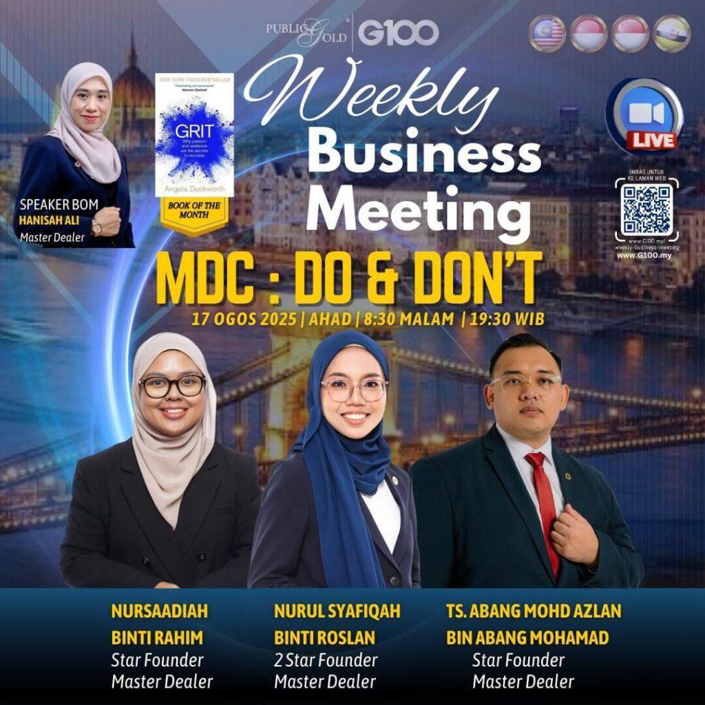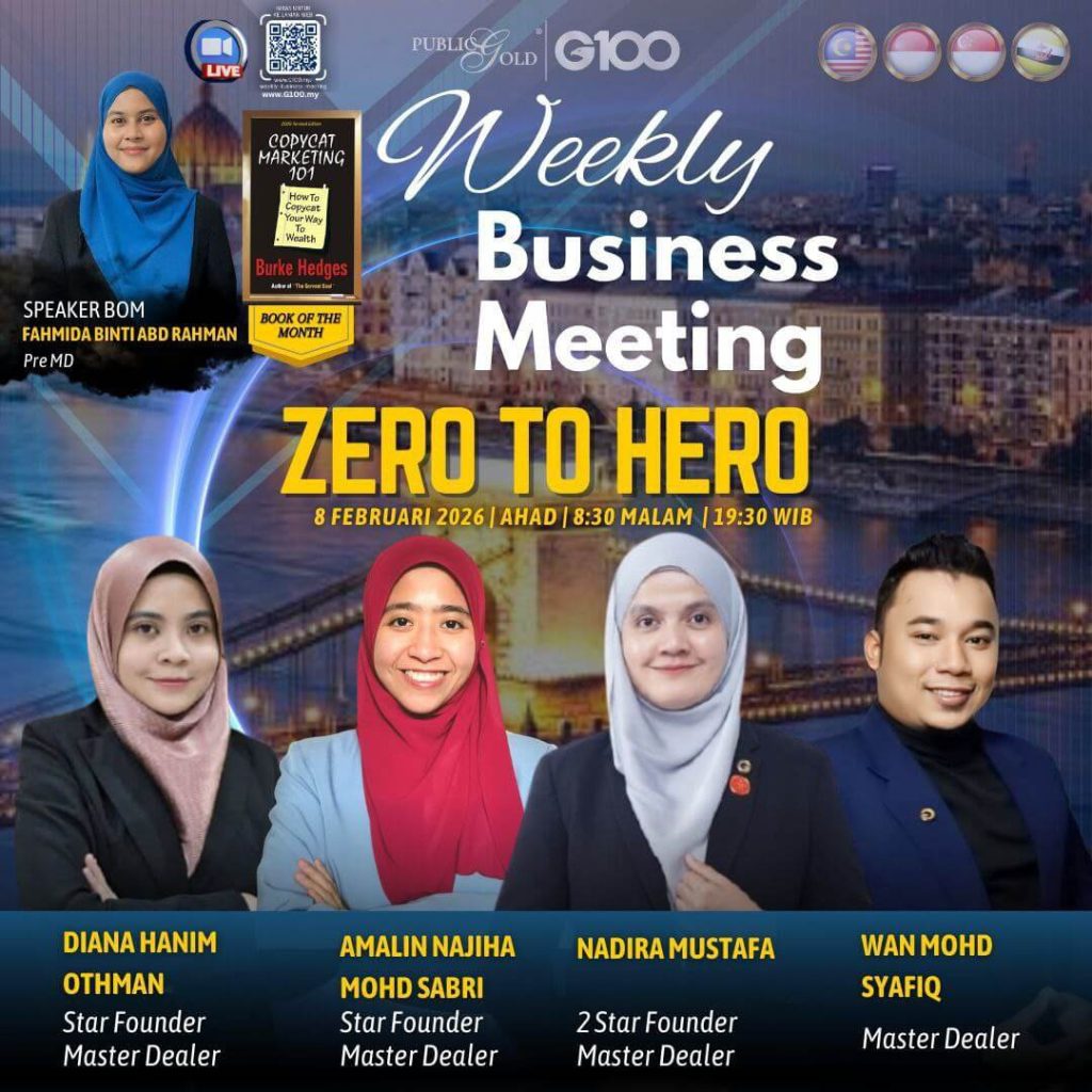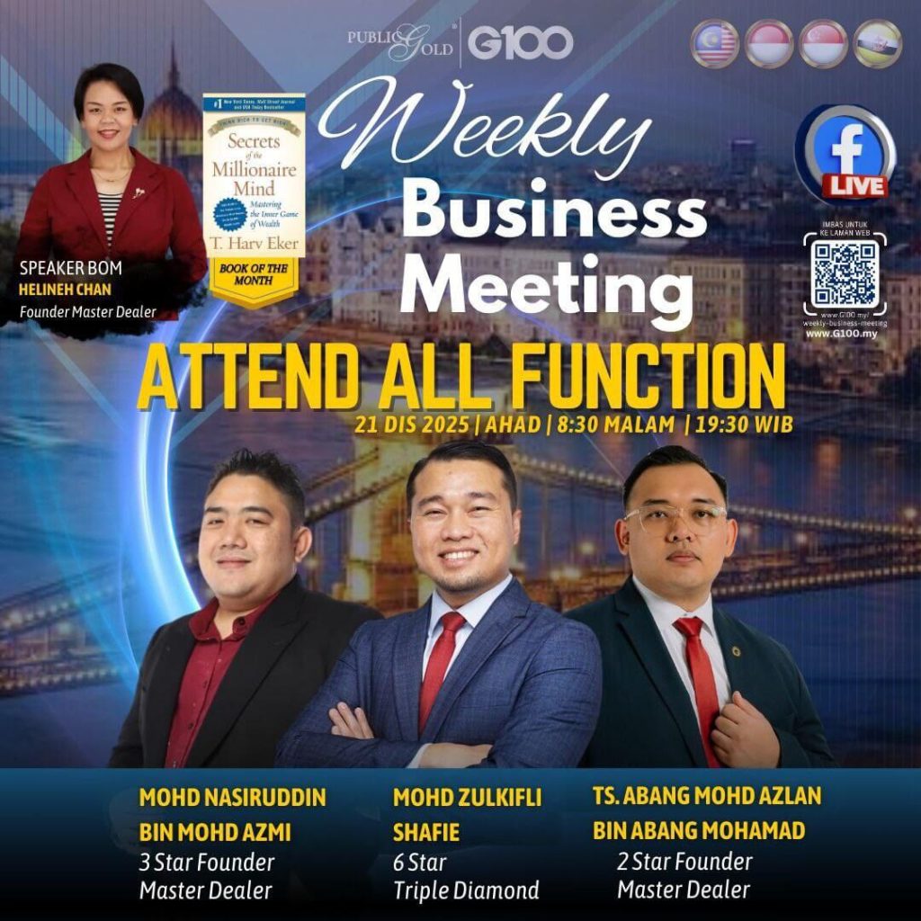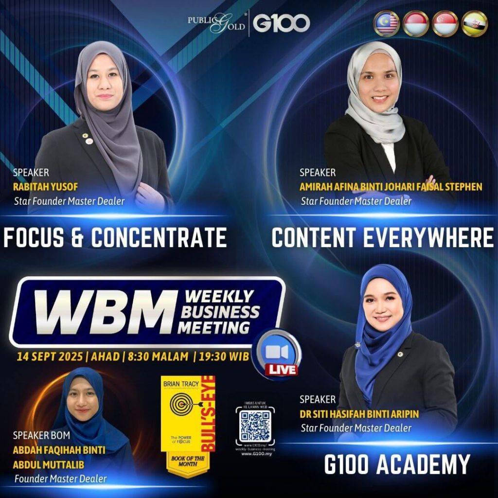 Peluang dapatkan input terkini, associate sesama team G100 yang positif, dan rungkaikan sebarang persoalan tentang bisnes setiap minggu supaya sentiasa bermotivasi.
